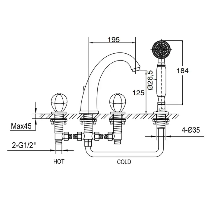 Maier Klass Смеситель на борт ванны, на 4 отв., с ручным душем, цвет: хром 75 714MCR