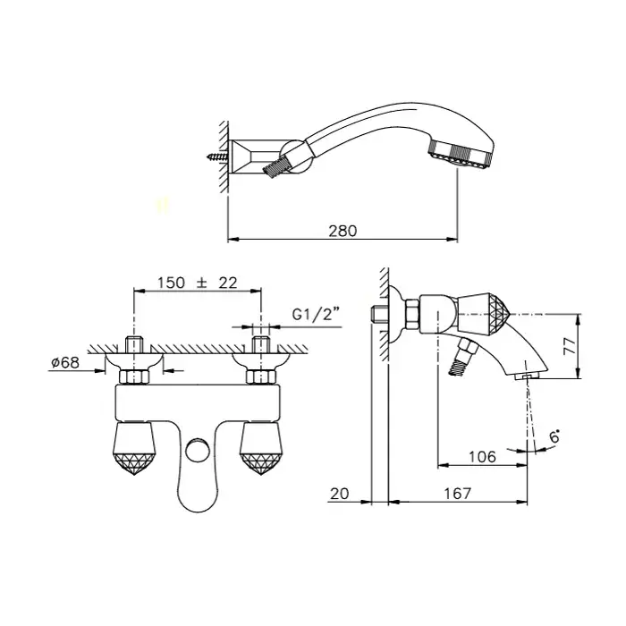 Nicolazzi Cristallo Смеситель для ванны с 2мя ручками, с душевой лейкой, цвет хром 2002CR22
