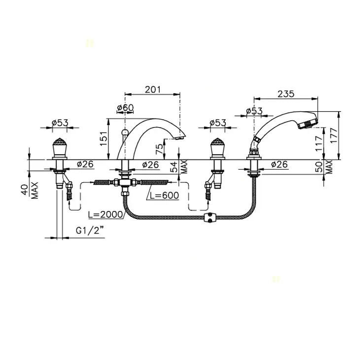 Nicolazzi Cristallo Смеситель на борт ванны, 4 отв., излив: 204 мм, с ручным душем, цвет: золото