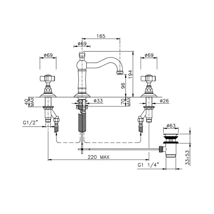 Nicolazzi Dames Anglaises Смеситель для раковины на 3 отверстия, с донным клапаном, излив: 165мм, цвет: хром