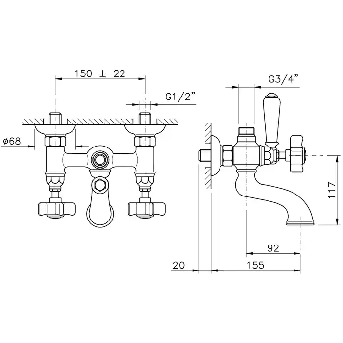 Nicolazzi Dames Anglaises Смеситель для ванны, на 2 отв, с переключателем ванна/душ, вывод сверху 3/4, цвет: Bronze Plated