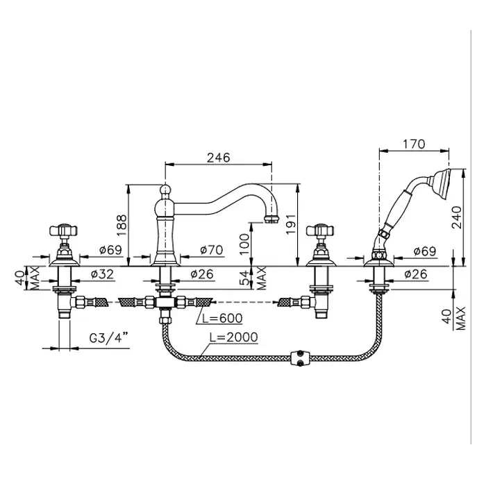 Nicolazzi Dames Anglaises Смеситель на борт ванны, на 4 отв., с изливом 24,6 см, цвет: хром 1449CR18