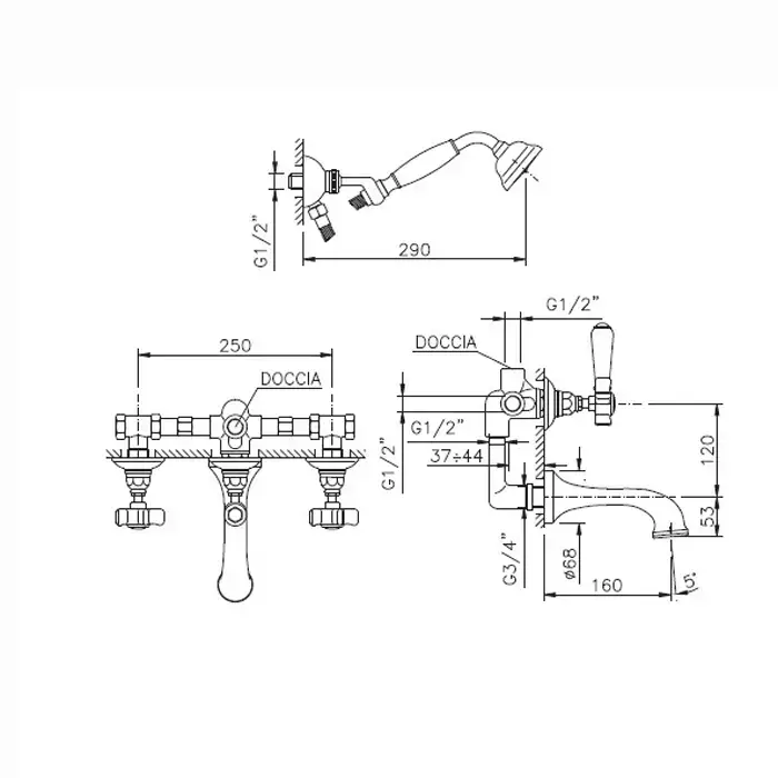 Nicolazzi El Capitan Смеситель встраеваемый для ванны с 2мя ручками, с ручным душем, с изливом из стены, цвет: хром