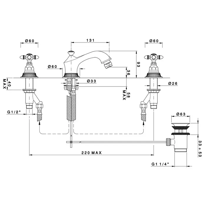 Nicolazzi Impero Смеситель для биде, на 3 отв., с дон. клапаном, излив 13,1 см, цвет: хром 1215CR36