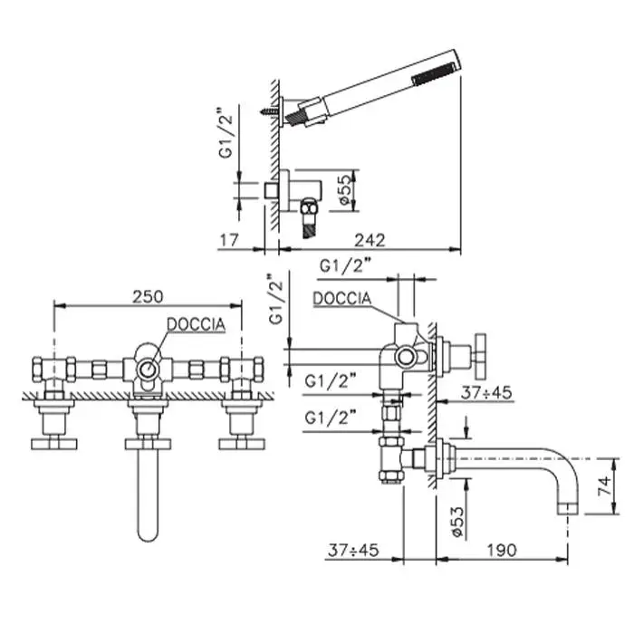 Nicolazzi M.Croce Встраиваемый Смеситель для ванны с 2мя ручками с переключателем ванна/душ, + комплект руч. душа, цвет: хром