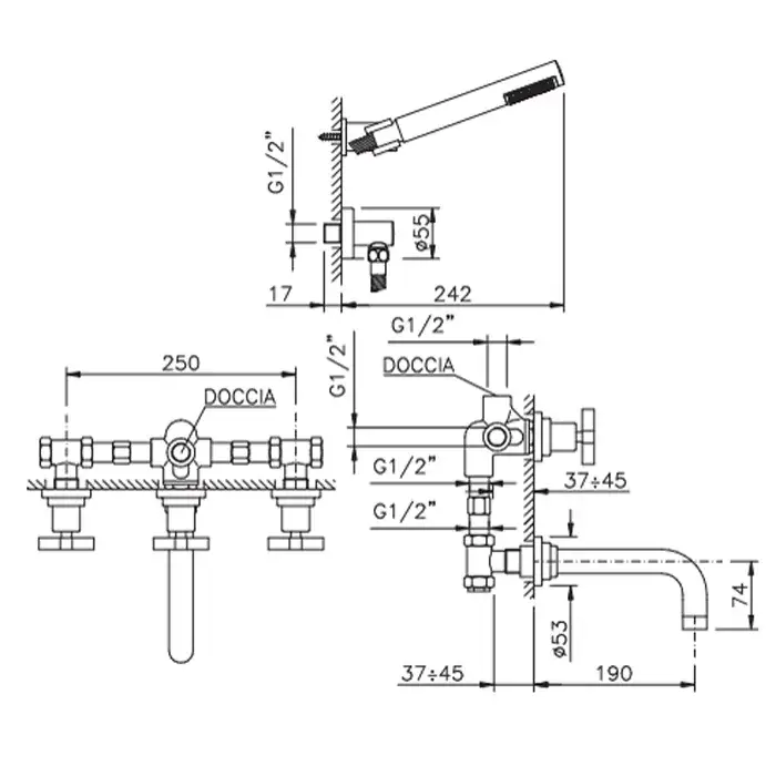 Nicolazzi Monte Croce Смеситель для ванны с 2мя ручками, встроенный, вкл. внутр часть + комплект руч. душа, цвет: золото