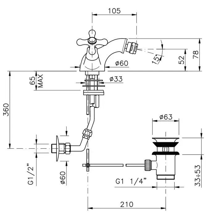 Nicolazzi Nuova Brenta Смеситель для биде на 3 отверстия, с донным клапаном, излив: 132мм, цвет: хром