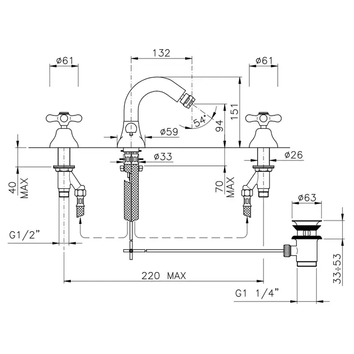 Nicolazzi Nuova Brenta Смеситель для биде на 3 отверстия, с донным клапаном, излив: 132мм, цвет: хром