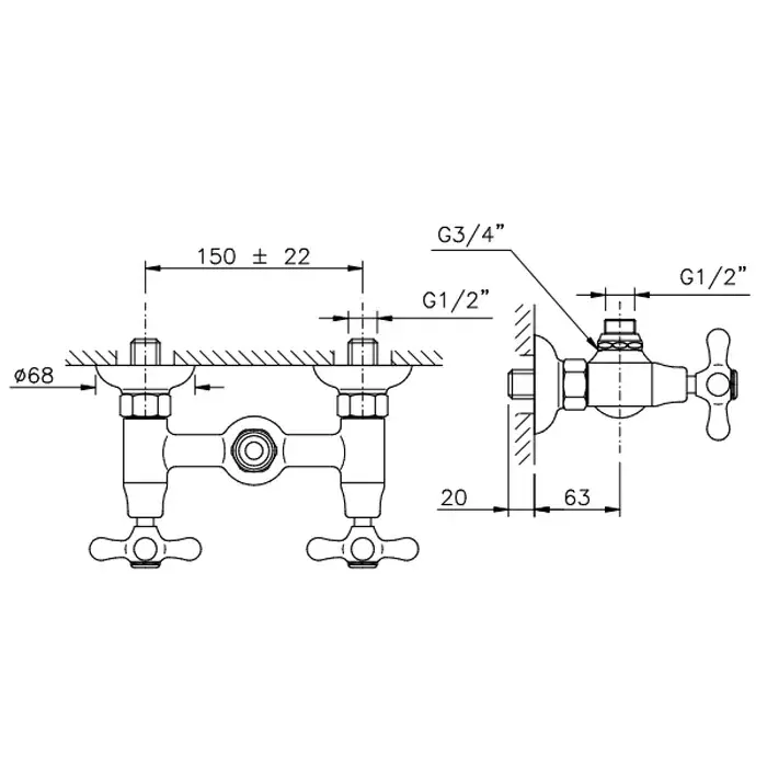 Nicolazzi Nuova Brenta Смеситель для раковины с 2мя ручками, настенный, излив: 160мм, цвет: хром