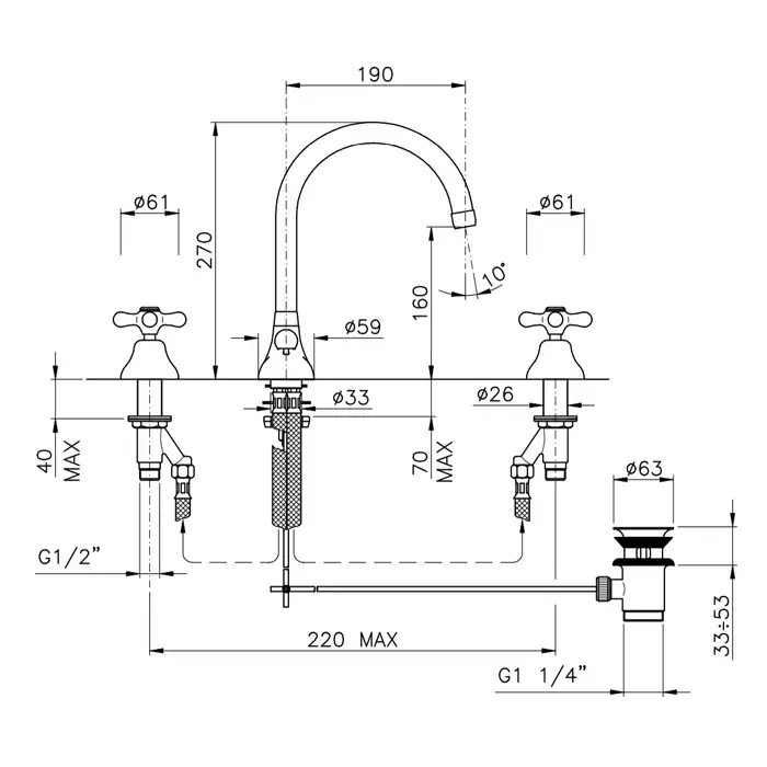 Nicolazzi Nuova Brenta Смеситель для раковины на 3 отверстия, с донным клапаном, высокий поворотный излив: 190мм, цвет: хром