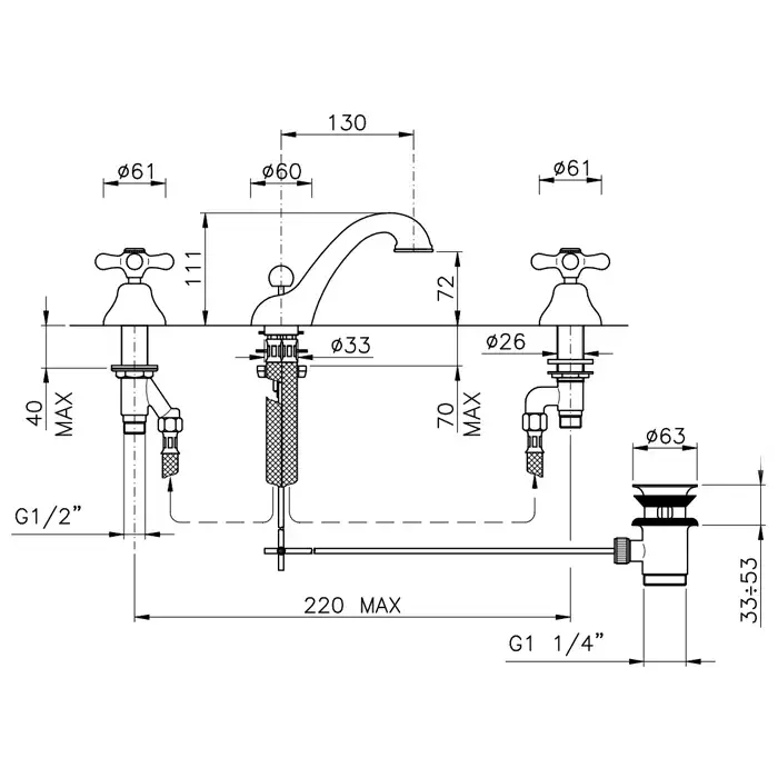 Nicolazzi Nuova Brenta Смеситель для раковины на 3 отверстия, с донным клапаном, излив: 130мм, цвет: хром