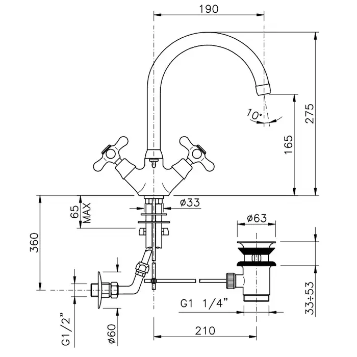 Nicolazzi Nuova Brenta Смеситель для раковины на 3 отверстия, с донным клапаном, высокий поворотный излив: 190мм, цвет: хром