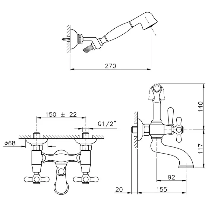 Nicolazzi Nuova Brenta Смеситель для ванны с 2мя ручками, настенный, с душевой лейкой, цвет: бронза