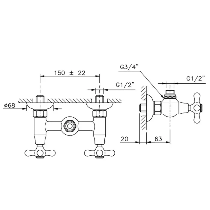 Nicolazzi Nuova Brenta Смеситель для раковины с 2мя ручками, настенный, излив: 160мм, цвет: хром