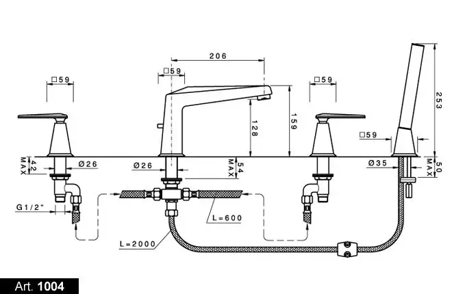 Nicolazzi Vincent Смеситель на борт ванны, 4 отв., излив: 206 мм, с ручным душем, цвет: хром