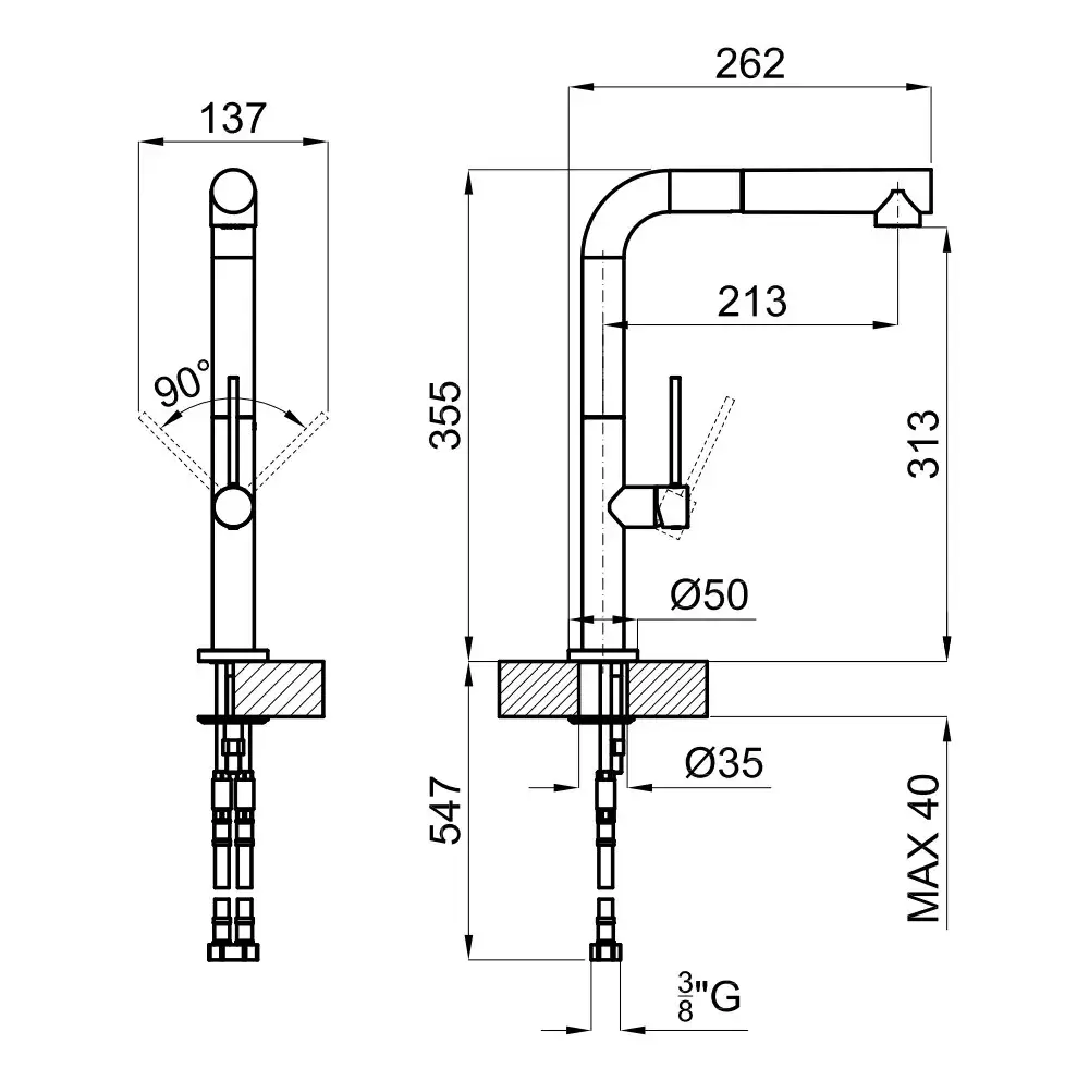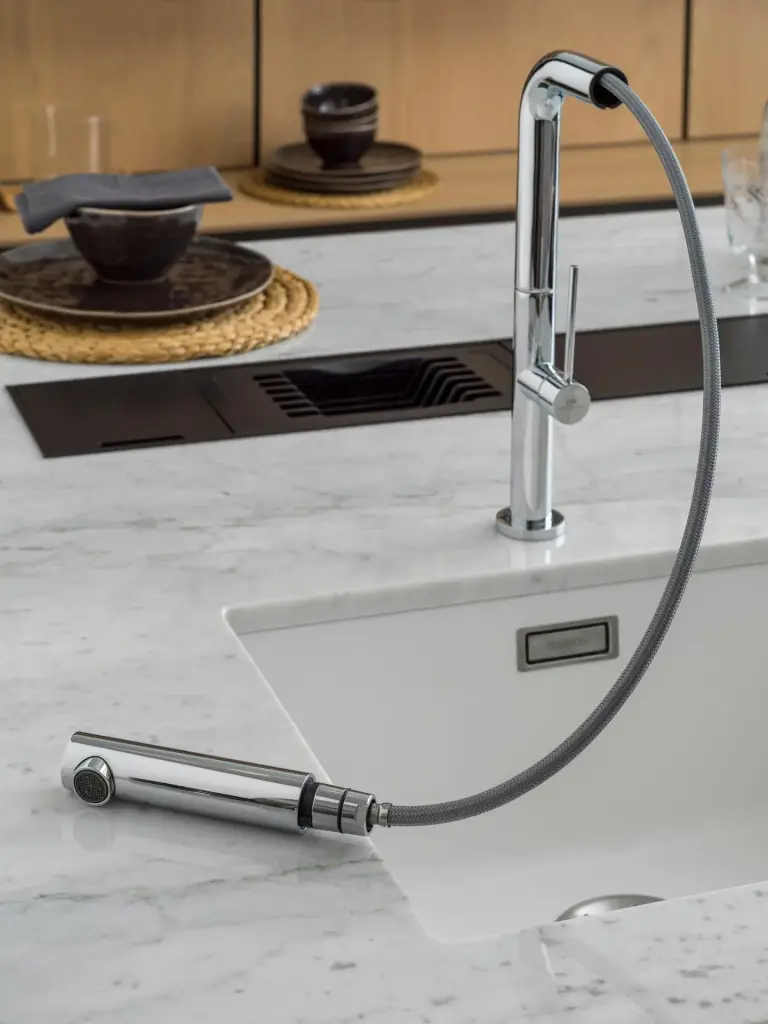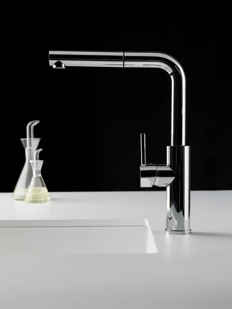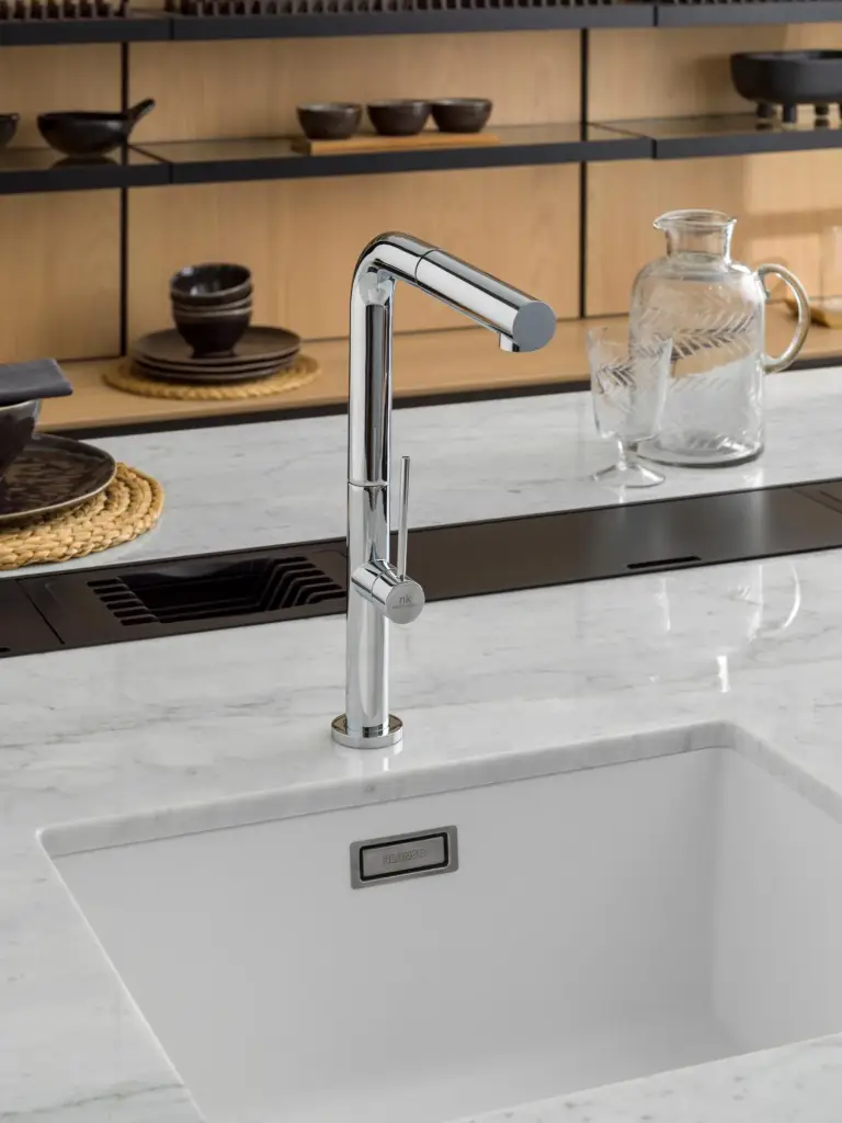 NOKEN BRIDGE SLIM Однорычажный смеситель для мойки, поворотный излив, выдвижной душ, хром