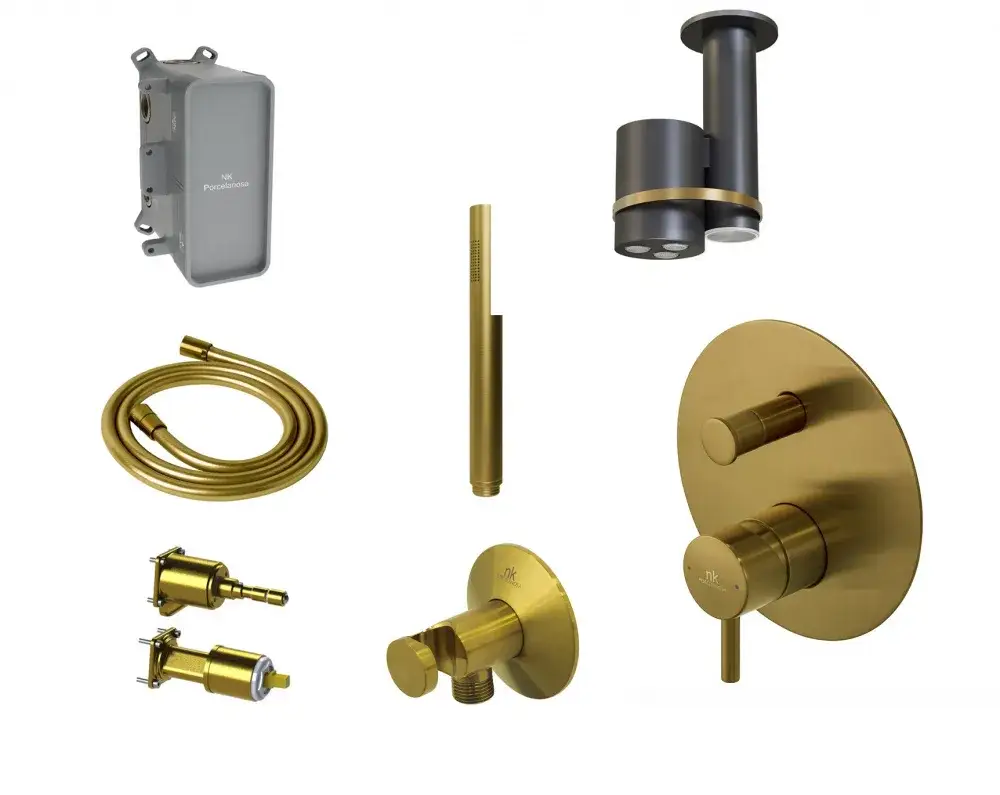 NOKEN PACK EYE Душевой комплект со смесителем, потолочной лейкой с хромотерапией, браш. золото