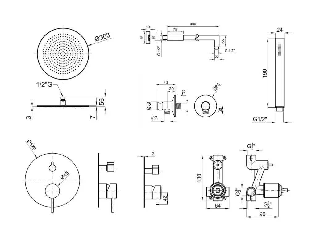 NOKEN PACK RONDO Комплект для душа, с верхним душем NEPTUNE SLIM Ø30 см, браш. золото