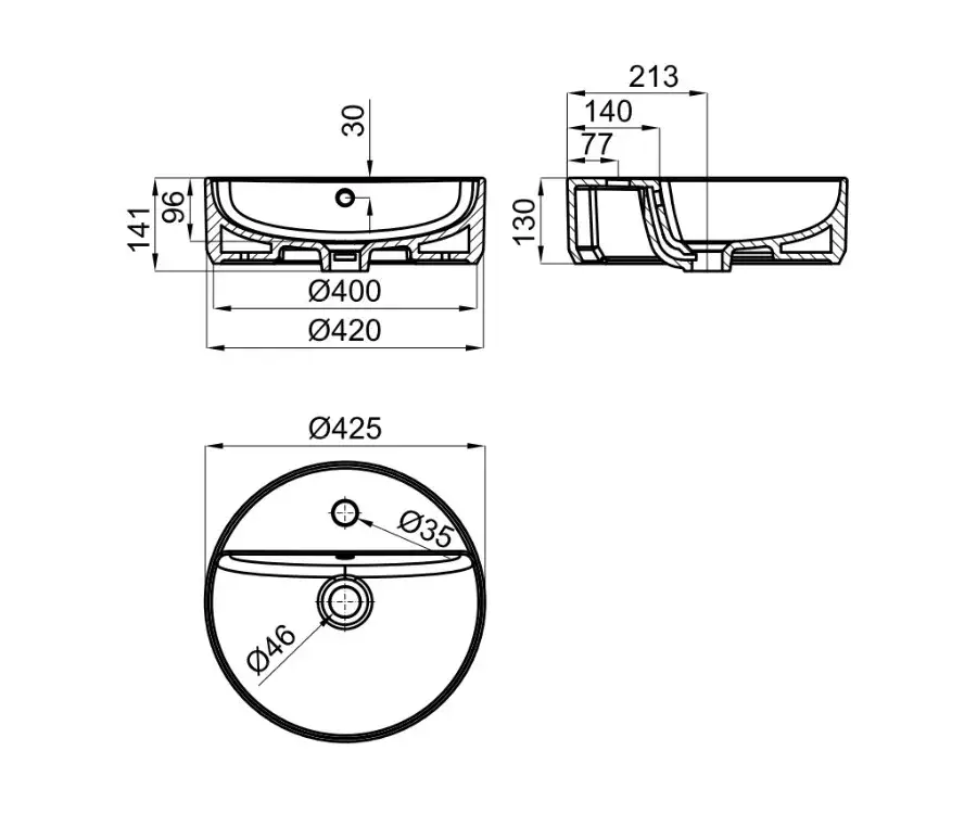 NOKEN RONDO Раковина Ø43 см на столешницу, с переливом, 1 отв., белый