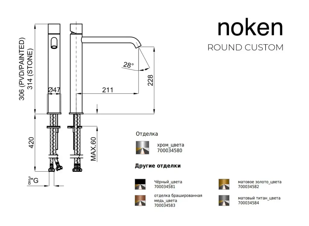 NOKEN ROUND CUSTOM Смеситель для раковины высокий H306 мм, 3/8”, 5 л/мин, без ДК, хром/colors.