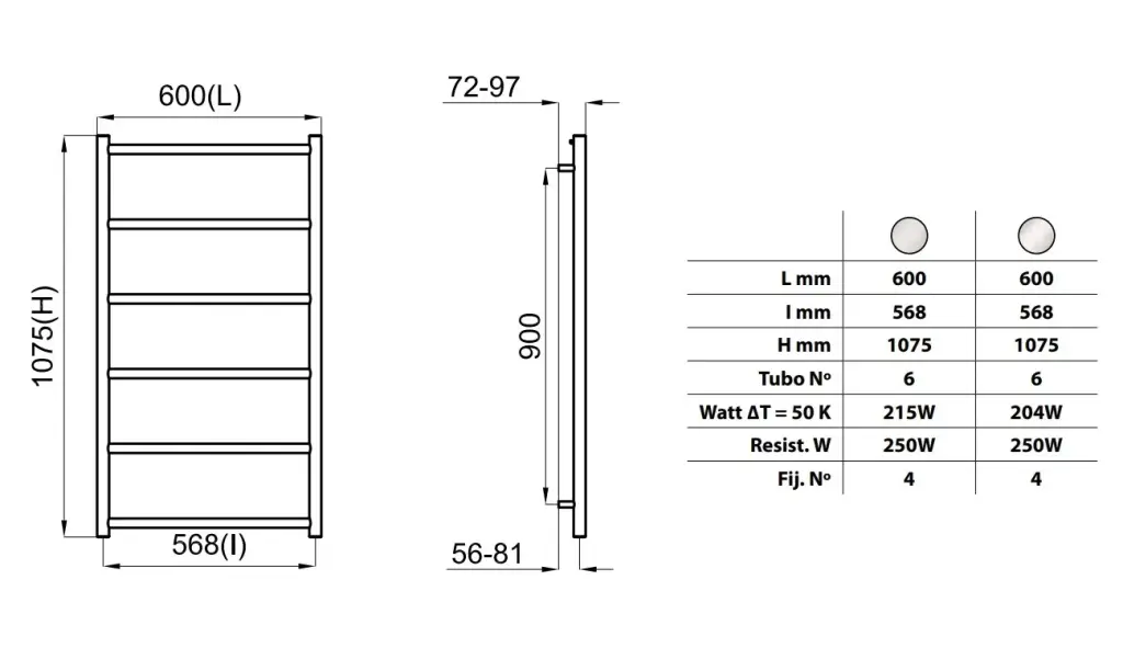 NOKEN TONO (EL1) Дизайн радиатор (электрика с резистором) 600xH1075 мм, BRUSHED STAINLESS STEEL