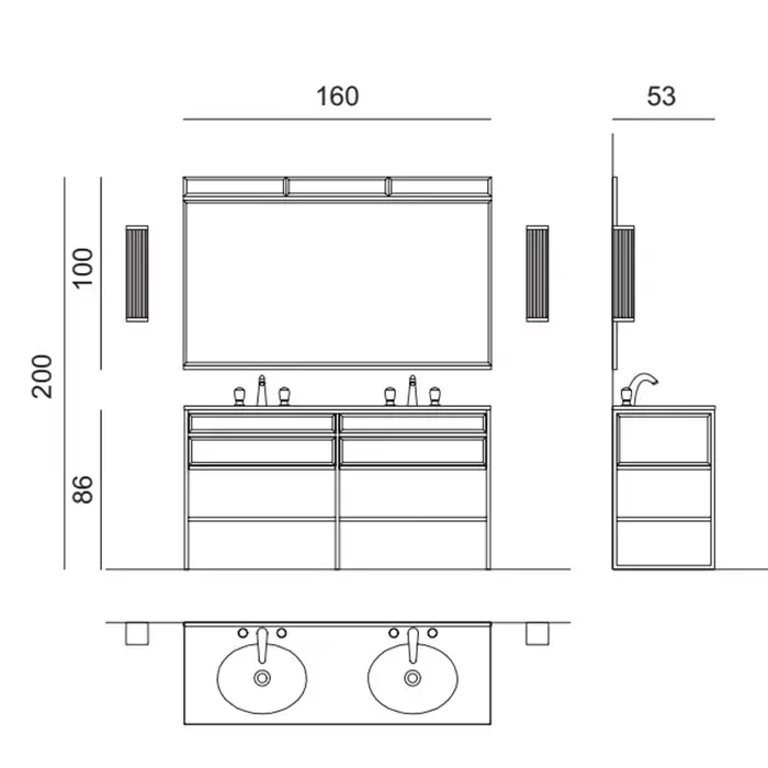 OASIS ACADEMY Консоль под 2 раковины 1600х530х840 мм., напольная, 2 ящика, 2 полки, структура хром, отделка Diamond Smoke Mirror
