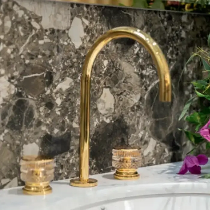OASIS ACADEMY Консоль под 2 раковины 1900х530х840 мм., напольная, 3 ящика, 2 полки, структура золото, отделка Ribbed Glass Cemento глянцевый