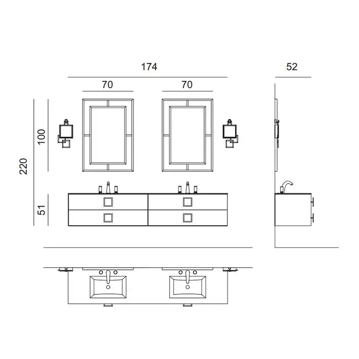 OASIS DAPHNE Столешница стеклянная 1750х530х10 мм., с 2 интегрированными раковинами, с 3 отверстиями для каждого смесителя, цвет Nero глянцевый