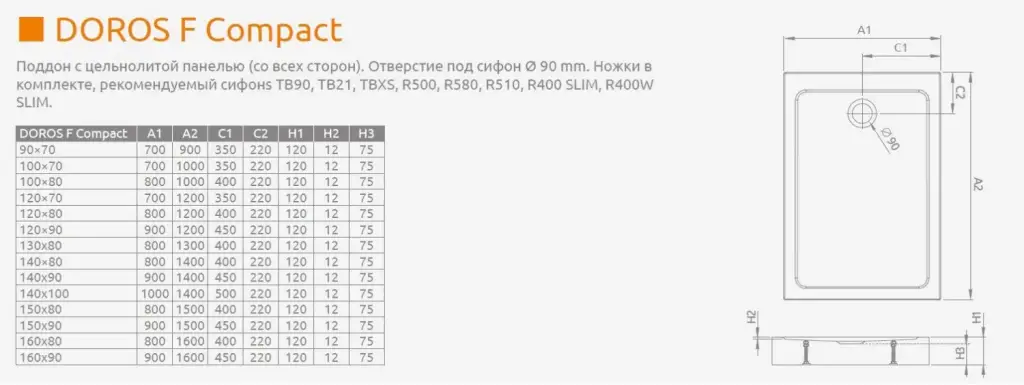 Radaway Doros F Compact Поддон для душа из акрила, 100х70х12h см, цвет: белый глянцевый SDRFP1070-05