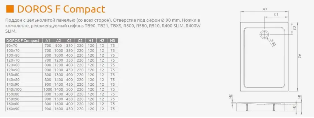 Radaway Doros F Compact Поддон для душа из акрила, 160х90х12h см, цвет: stone black SDRFP1690-05-54S