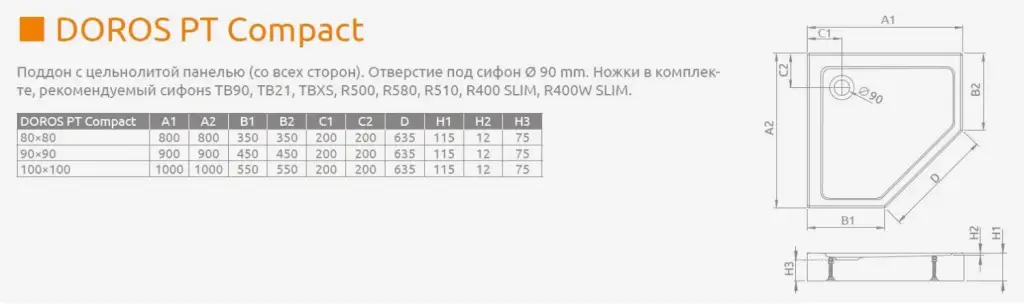 Radaway Doros PT Compact Поддон для душа из акрила, 100х100х11,5h см, цвет: stone black SDRPT1010-05-54S