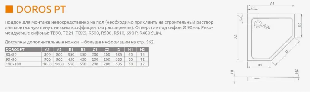 Radaway Doros PT Поддон для душа из акрила, 90х90х5h см, цвет: белый глянцевый SDRPT9090-01