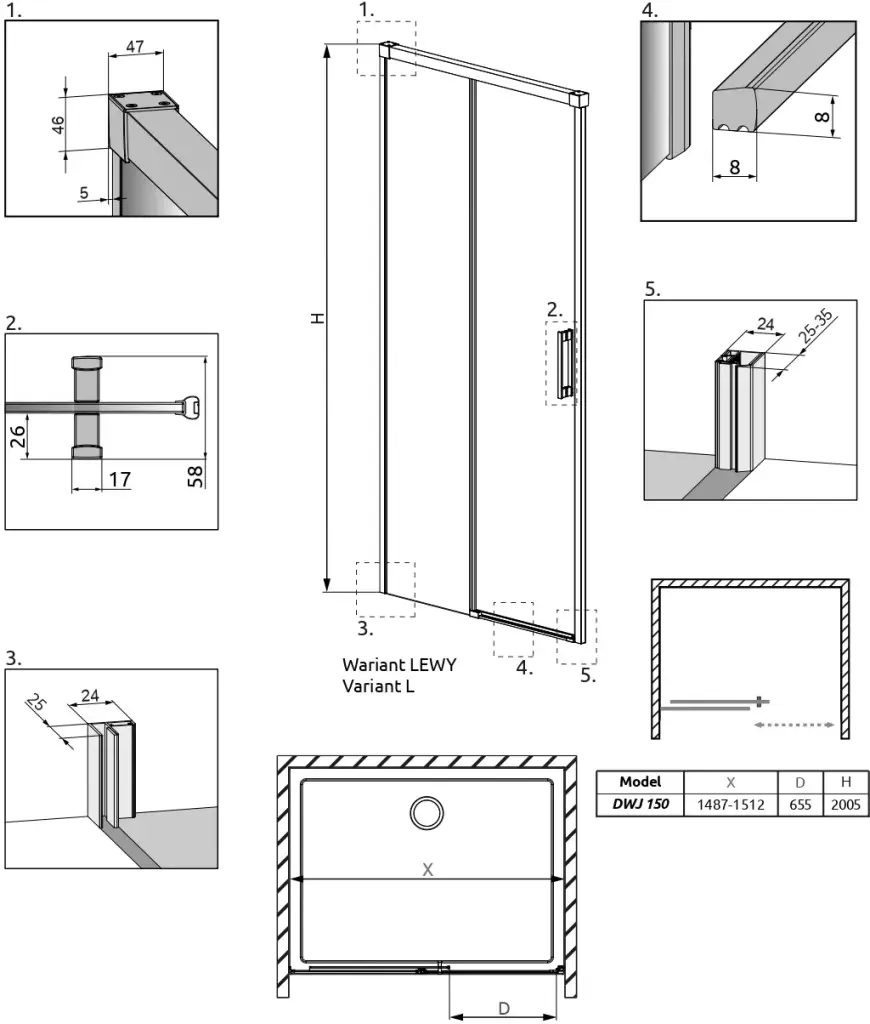 Radaway Idea DWJ Душевая дверь в нишу, левая, прозрачная 6 мм, Easy Clean 150х200h см, цвет: black 387019-54-01L