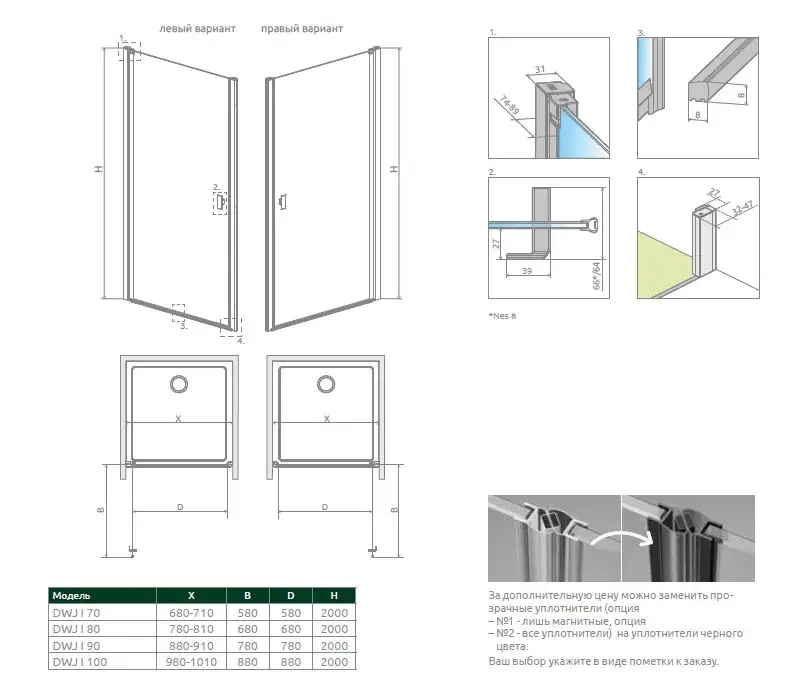 Radaway Nes 8 DWJ I Душевая дверь в нишу, левая, Frame 8 мм, Easy Clean 70х200h см, цвет: black 10076070-54-56L