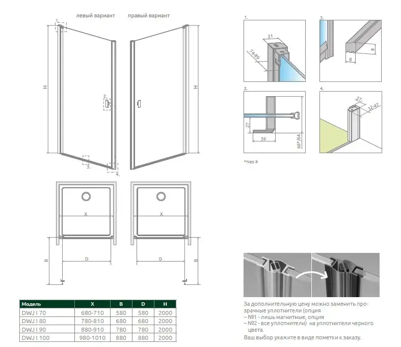 Radaway Nes 8 DWJ I Душевая дверь в нишу, левая, Frame 8 мм, Easy Clean 80х200h см, цвет: black 10076080-54-56L