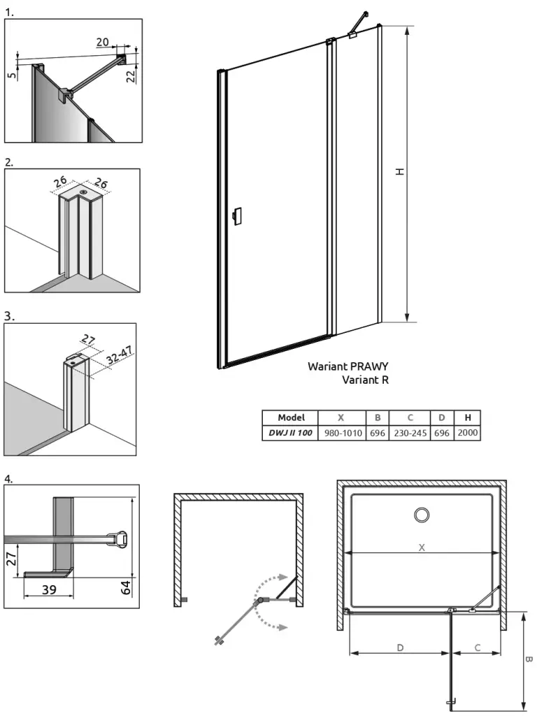 Radaway Nes DWJ II Душевая дверь в нишу, правая, прозрачная 6 мм, 100х200h см, цвет: хром глянцевый 10036100-01-01R