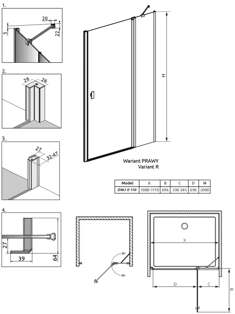 Radaway Nes DWJ II Душевая дверь в нишу, правая, прозрачная 6 мм, 110х200h см, цвет: хром глянцевый 10036110-01-01R