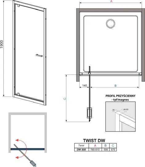 Radaway Twist Душевая дверь, прозрачная 6 мм, Easy Clean 80х190h см, цвет: хром глянцевый 382001-01