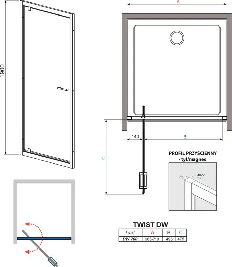 Radaway Twist DW Душевая дверь в нишу, прозрачная 6 мм, Easy Clean 70х190h см, цвет: хром глянцевый 382000-01