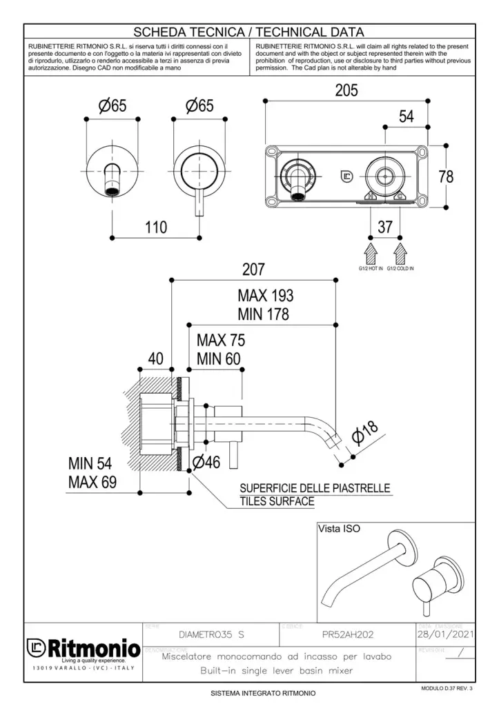 Ritmonio Diametro35 S Смеситель для раковины встраив., излив 19,3 см, внеш. часть, цвет: черный хром PR52AL202BLX
