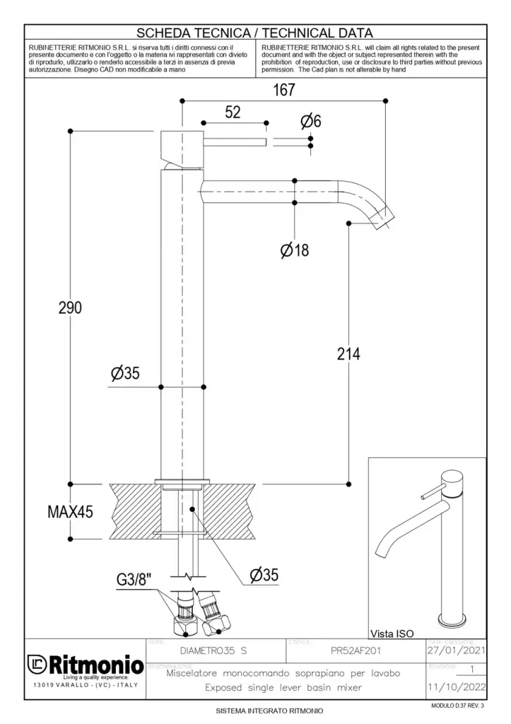 Ritmonio Diametro35 S Смеситель для раковины высокий, без д/к, излив 16,7 см, цвет: crl chrome PR52AF201CRL