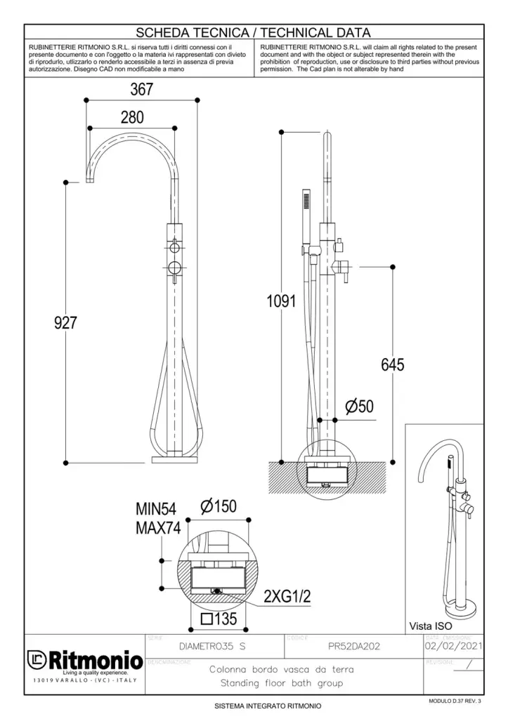 Ritmonio Diametro35 Смеситель напольный с душ. наб. - руч. душ, шланг, внеш. часть, цвет: ix brushed PR52DB202IX