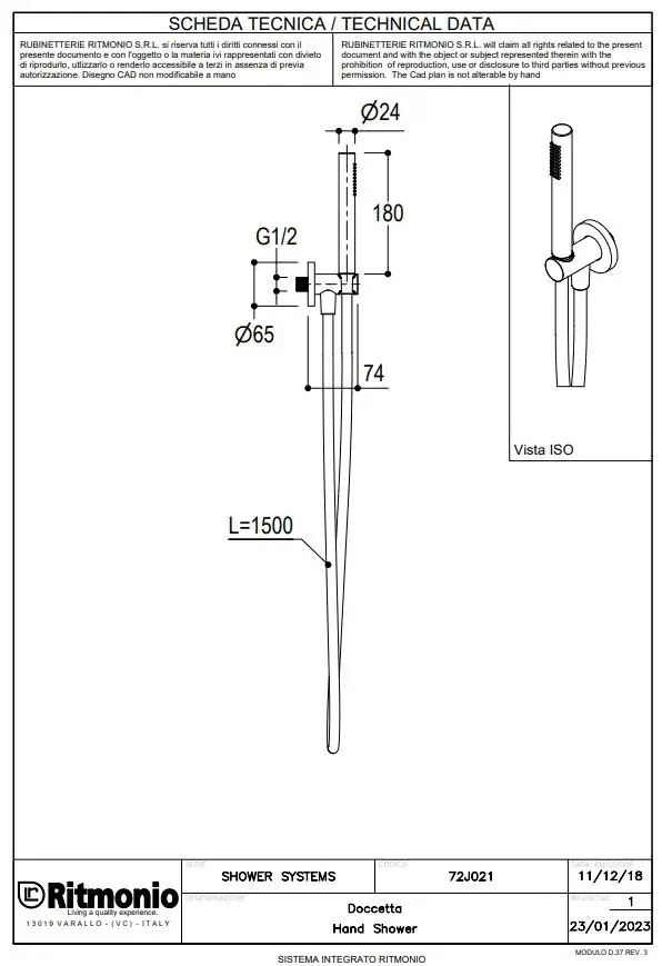 Ritmonio Душевой гарнитур: душевая лейка, держатель с выпуском, шланг 150 см, цвет: ix brushed 72J021IX