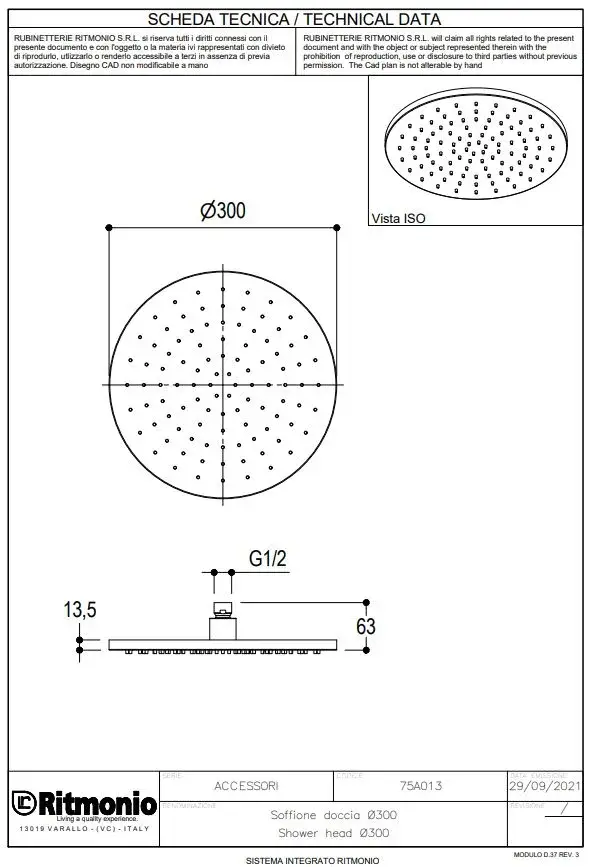 Ritmonio Верхний душ круглый d30 см, с 1 видом струи, цвет: ix brushed 75A013IX