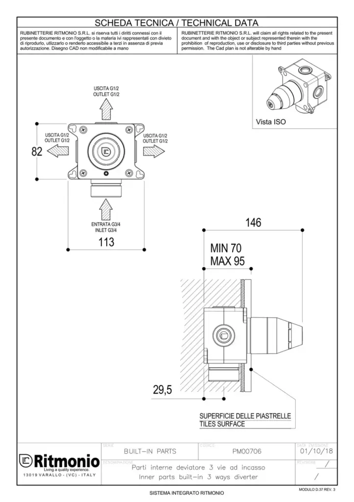 Ritmonio Встраиваемая часть переключателя, на 3 потребителя PM00706