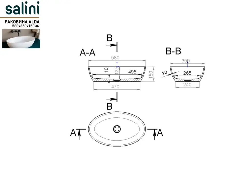 Salini Alda Раковина накладная 58х35х15cм, без отв., без перелива, материал: S-Stone, цвет: Tarpaulin grey