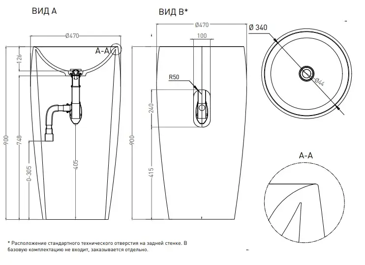 Salini ARMONIA TOP 01 Раковина напол 450х450х850/900мм, без отв.под смеситель, донный клапан "Up&Down",S-Sense, белый глянц (СЛИВ в стену)