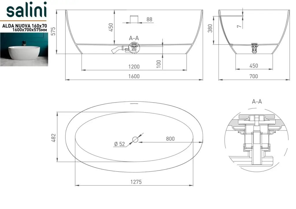 Salini Alda Ванна из S-Stone отдельностоящая 160x70 см, цвет: RAL полностью матовый 101924MF