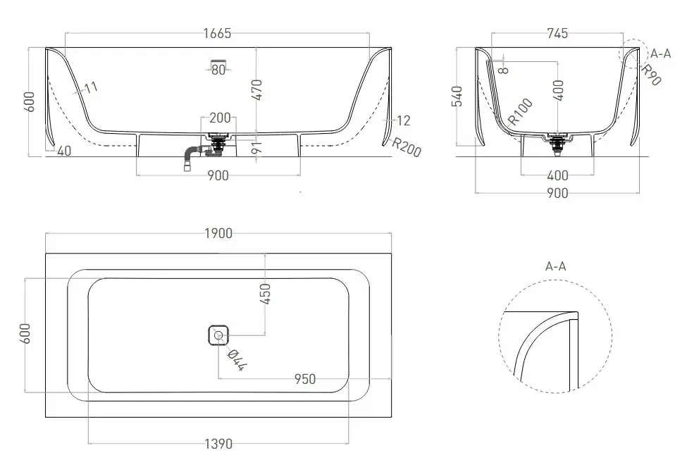 Salini Aria Ванна из S-Sense отдельностоящая 190х90 см, слив по центру, цвет: белый глянцевый 1051101G