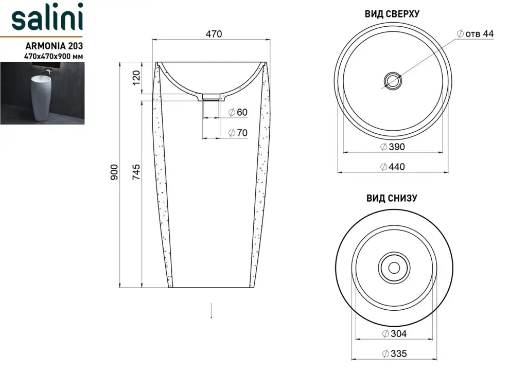 Salini Armonia Round Top 01 Раковина напольная 45х45х90см., слив в стену, без отв. под смес, с декор.накладкой, мат-л: S-Sense, цвет: белый глянцевый